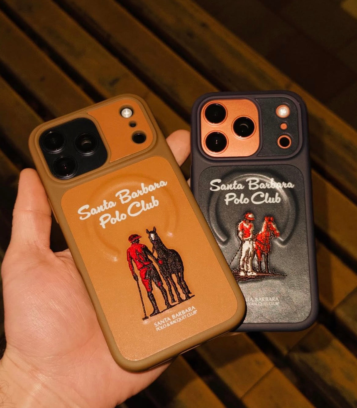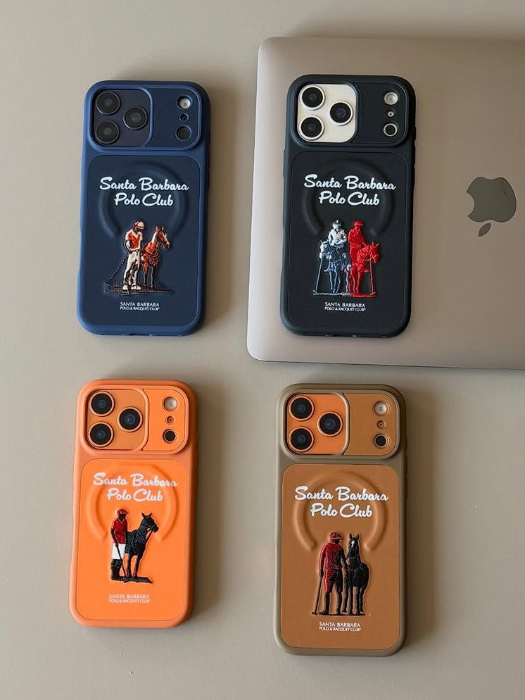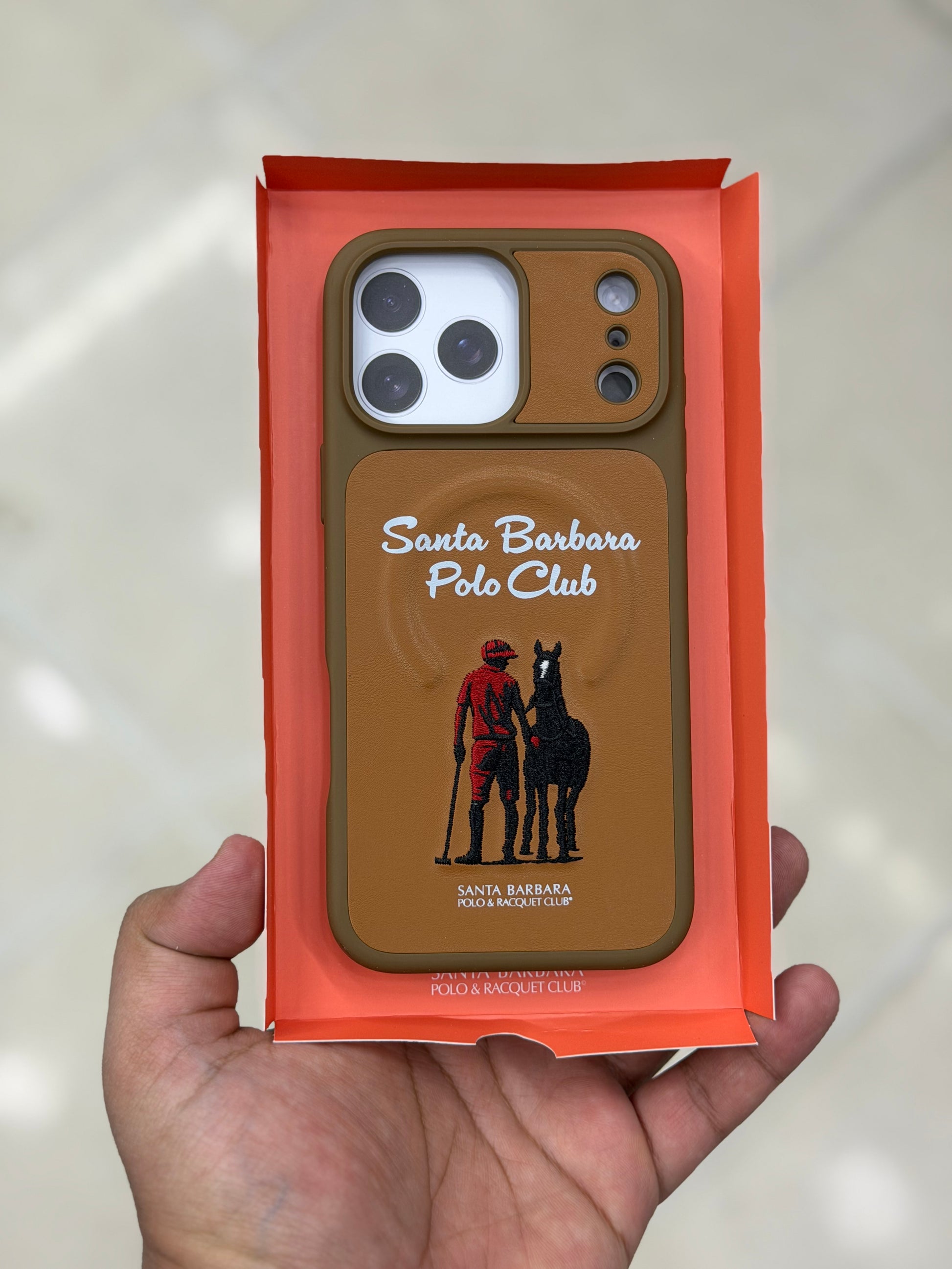 Upgrade your iPhone 17 Pro Max with this premium Polo leather MagSafe case. Designed with a stylish Santa Barbara Polo Club logo, it combines luxury with durability. Available in Orange, Black, Blue, and Brown, this case ensures both elegance and reliable protection. Perfect fit with MagSafe compatibility for seamless charging.